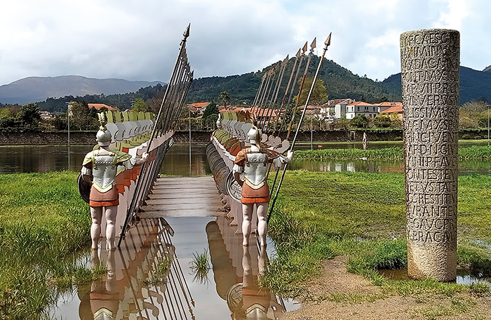 Eine Legende besagt, dass der römische General Decimus Junius Brutus den Fluss mit seiner Legion durchqueren wollte. Doch die Soldaten zeigten Widerstand, weil es hieß, wer den Fluss durchquere, verliere sein Gedächtnis. Unerschrocken durchquerte Decimus ­Junius Brutus mit seinem Pferd den Fluss und rief von der anderen Seite jeden Soldaten beim Namen auf, um zu beweisen, dass er sie nicht vergessen hatte. Auf diese Weise überzeugte er alle, ebenfalls überzusetzen. Zu Ehren dieser Legende stehen zwei Reihen römischer Soldaten an einem Ufer und Junius ­Brutus am ­gegenüberliegenden. Doch bevor wir die ­Brücke überqueren, besuchen wir erst das ­historische Stadtzentrum.