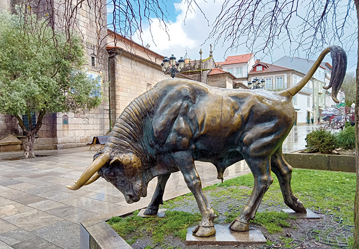 Nahe den beiden Kirchen sehen wir die Skulptur eines Stiers – eine Hommage an eines der traditionsreichsten Feste von Ponte de Lima, das viele Besucher anzieht: „Vaca das Cordas“. Der Name – Kuh am Seil – täuscht, denn es handelt sich um einen Stierlauf, ähnlich wie in Pamplona. Am späten Nachmittag des Vortages von Fronleichnam wird ein Stier zur Hauptkirche geführt und dort mit Seilen an das eiserne Fenstergitter des Glockenturms gebunden. Anschließend wird der Stier drei Runden um die Kirche getrieben und verursacht dabei viele Stürze unter den wagemutigen Zuschauern, die versuchen, ihn zu bezwingen, bevor der Lauf weiter durch die Straßen der Altstadt und über den Camões-Platz bis zum Flussufer führt.