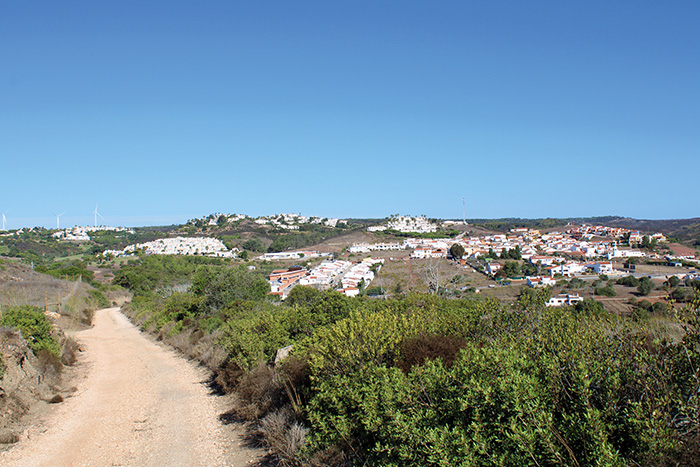 Um unsere Muskeln aufzuwärmen, geht es sofort leicht bergauf, mit Blick auf das Dorf und die umliegenden touristischen Anlagen. 1,4 km führt uns ein breiter Schotterweg durch die Landschaft. Am Wegesrand gedeihen Mastixsträucher, Steineichen, vereinzelte Feigenbäume und viel Fenchel, der angenehm duftet. Etwa 20 Minuten später, an der Gabelung mit der Straße M 537, entscheiden wir uns gegen die empfohlene Richtung und wandern stattdessen in die entgegengesetzte, um zuerst entlang der Küste zu wandern. 900 m laufen wir am schmalen Straßenrand entlang und gelangen zum Hauptplatz von Salema. Das ehemalige Fischerdorf hat sich, ebenso wie das östlich gelegene Burgau, in ein Resort verwandelt. Am Strand liegen noch vier Fischerboote, aber abgesehen von ein paar älteren Männern, die im Schatten eines Hauses sitzen, sehen wir hier kaum noch Einheimische. Mehr als die Hälfte der Häuser – viele der Tradition getreu weiß getüncht und mit blauen Umrandungen um Fenster und Türen versehen – werden heute als Ferienunterkunft genutzt. Die Atmosphäre erinnert leider kaum noch an ein portugiesisches Dorf.