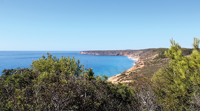 Zurück am Aussichtspunkt wandern wir erneut Richtung Norden und folgen den Markierungen, die uns durch eine Siedlung mit Luxusvillen und Reihenhäusern führen, alle am Hang nach Süden zum Atlantik hin ausgerichtet und viele mit Pools, obwohl der weite Ozean nur wenige Meter entfernt liegt. Dann biegen wir links ab, gehen am Rand eines Pinienwaldes entlang bis zur Küste und folgen schmalen Trampelpfaden direkt oberhalb der Klippen. Der Ausblick lässt uns immer wieder innehalten – die Küste der Algarve enttäuscht nie! Nachdem wir einige Meter entlang der Klippen gegangen sind, führt uns der Weg wieder ins Land hinein. In diesem Abschnitt ist die Vegetation dichter und die Route sehr naturbelassen. Zurück an der Küste passieren wir eine erste Bucht und kommen kurz darauf zum Praia Santa. Dieser Strand ist tatsächlich ein kleines heiliges Paradies. Wir umgehen die Schlucht und beschließen kurz hinabzusteigen, um einen Abstecher zum Strand zu machen. Dort treffen wir auf zwei junge Frauen, die die Einsamkeit, die Sonne und das Meer genießen. Eine gute Zeit für diese Wanderung dürfte der sogenannte Verão de São Martinho sein, die Tage rund um den Sankt-Martins-Tag, an denen in der Algarve meist die Sonne scheint und die Temperaturen angenehm sind. Mit etwas Glück ist sogar ein Sprung in den Atlantik möglich. Zwei Stunden nach dem Start erfrischen wir kurz unsere Füße, nehmen eine kleine Stärkung zu uns und setzen dann unsere Wanderung fort.